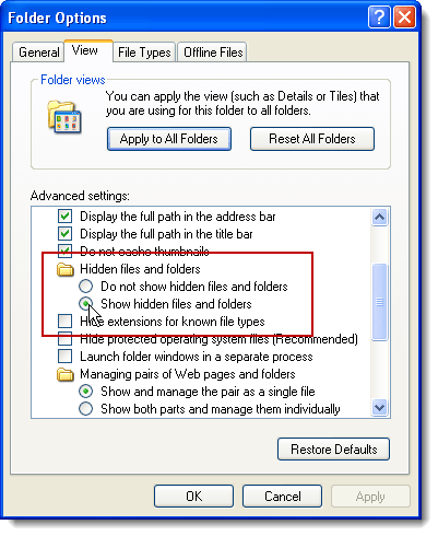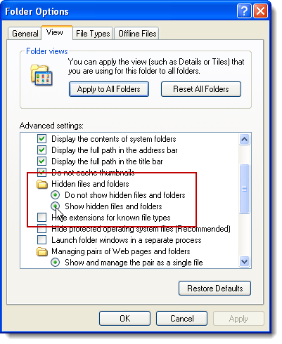 NOTE: Many viruses disable or corrupt the Hidden Files and Folders options so their hidden malicious executable or script will not be displayed in Explorer. Some viruses may even remove the Hidden Files and Folders options completely from the View tab of the Folder Options dialog box.