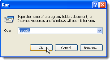 On the Run dialog box, enter “regedit” (without the quotes) in the Open edit box, and click OK.