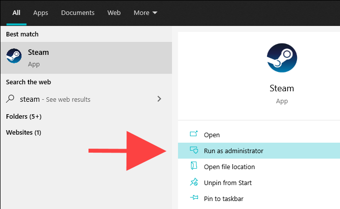 Start by completely exiting Steam. Then, search for Steam on the Start menu and select Run as Administrator. If that helps, learn how to set up Steam to run as an administrator always.