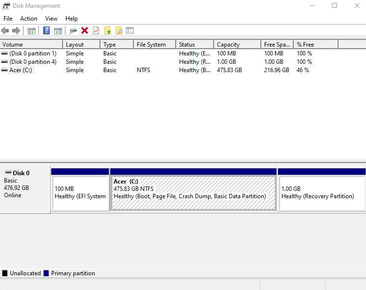 - The disk management window shows up, listing all the partitions on the current drive, along with their health.