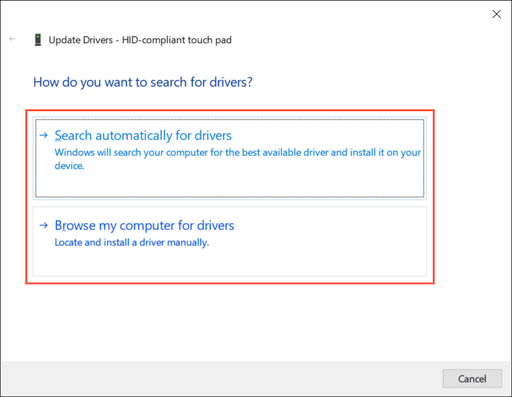 Select the touchpad driver within the Device Manager and select Action > Update driver. On the Update Drivers wizard, select Search automatically for drivers.