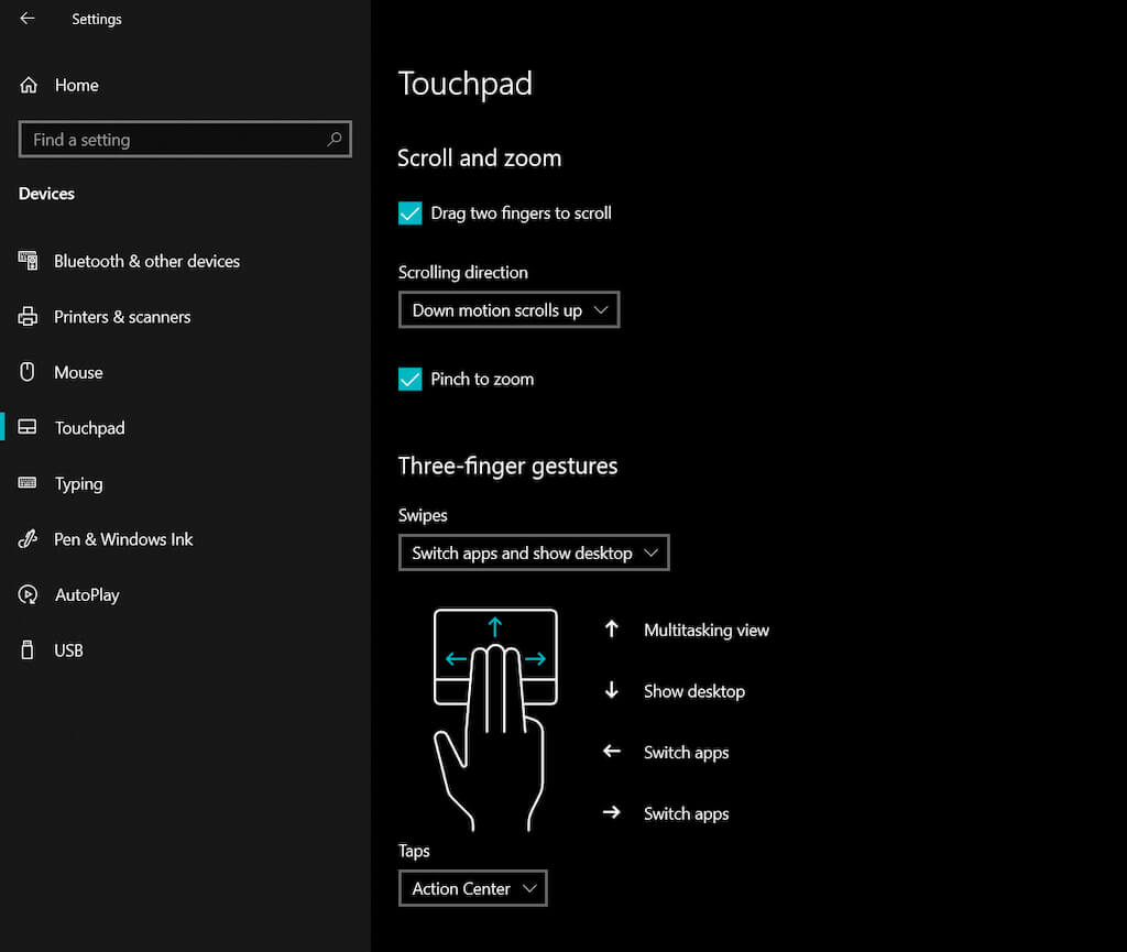 Scroll down to the Taps,** Scroll and zoom**, Three-finger gestures, Four-finger gestures sections, and ensure that nothing is amiss.