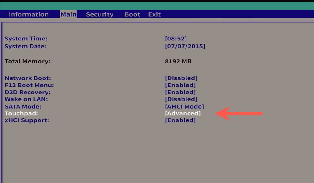 You could fix an unresponsive or malfunctioning touchpad by visiting your laptop’s BIOS/UEFI. Locate the touchpad setting and reconfigure it as needed. The procedure differs among laptop models, so you may want to refer to a user manual or online documentation for specific instructions. But here’s a general rundown.
