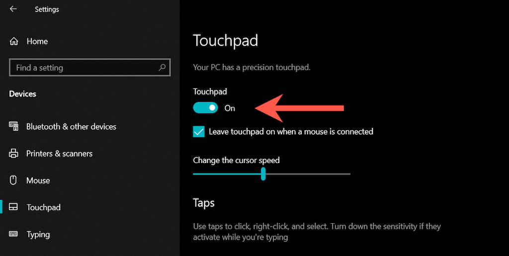Select **Touchpad **on the sidebar. Then, make sure that the switch underneath Touchpad is active.