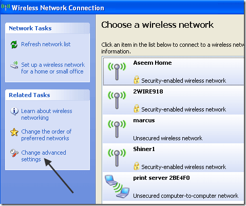 First, click on the wireless icon in your taskbar and under Related Tasks, choose Change advanced settings.