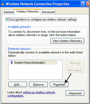 Now click on the Wireless Networks tab and select the network in the list at the bottom. Click on Properties once you select the wireless network that is having problems.