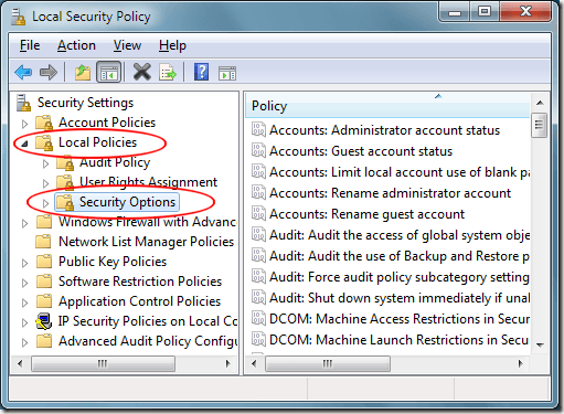In the left hand pane, click on the Local Polices Folder and then click on the Security Options folder. This will display a variety of local computer security policies from which to choose for your PC.