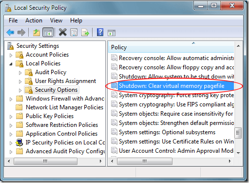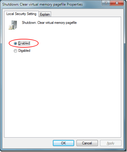 On the Local Security Setting tab, choose the Enabled option. Click the OK button and now every time you shut Windows 7 down, your PC’s virtual memory pagefile will be cleared of all data.
