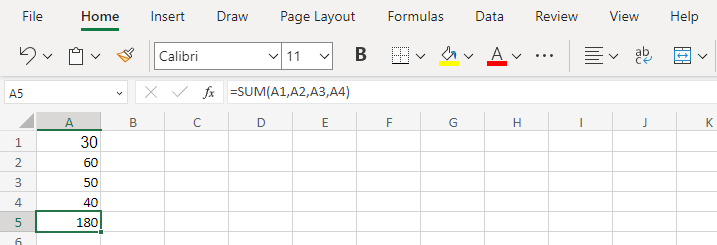 To shorten the formula even further, we can specify a range instead of entering the reference of every cell. For example, you can type A1:A4 to include the entire range of cells from A1 to A4. This can be extended across a row as well, and include as many cells as you want.