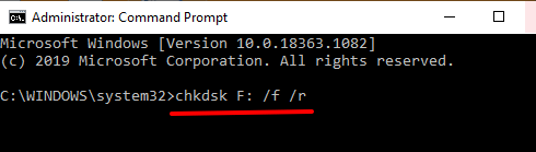 Type chkdsk, leave a space, type the drive letter followed by a colon (F: in this case), leave a space, type /f, leave a space, type /r, and press Enter. The command should look like this: chkdsk F: /f /r