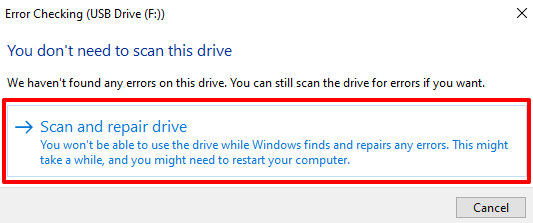 If the Graphical User Interface (GUI) version of the Check Disk utility doesn’t find any problem with the drive, use the Command-Line version of the tool to run a confirmation check. This version runs a thorough scan of your drive and might fix issues that the GUI Check Disk utility missed.