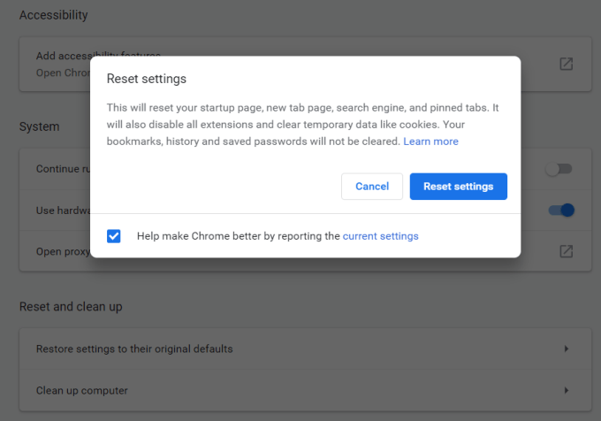 This will open a window with a warning that all Chrome settings will be reset. Just select Reset settings to continue.