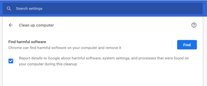This will open a window where you can launch the Chrome malware scan. Just select the Find button to start the scan.