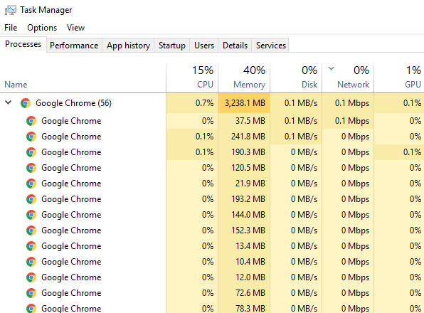 To see if this is the case, right-click the taskbar and choose Task Manager. In the Processes tab, you’ll see all of the Chrome processes that are still running in memory.