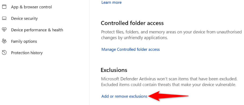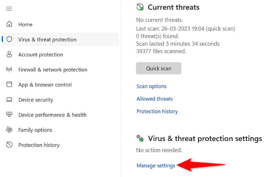 - Navigate to Virus & threat protection > Manage settings in the app.