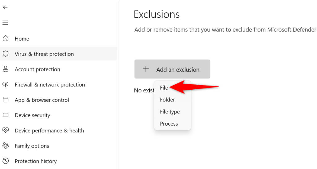 - Choose Yes in the User Account Control prompt. * Select Add an exclusion > File on the following page.