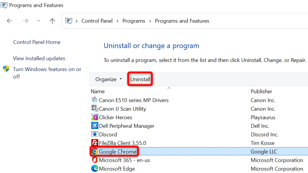 - Select Google Chrome on the list and choose Uninstall at the top.