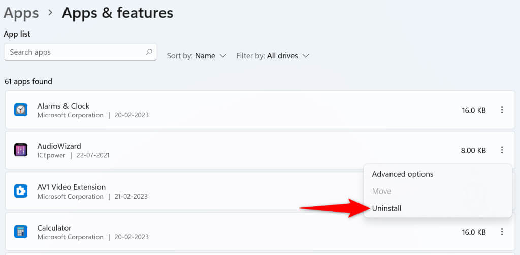 - Select Apps in the left sidebar and Apps & features on the right pane.