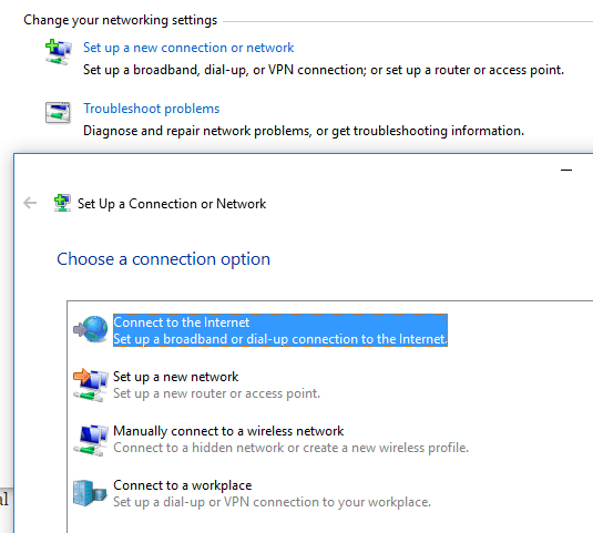 The next part I want to talk about is the section under Change your networking settings. In Windows 10, you can either setup a new connection or troubleshoot problems.