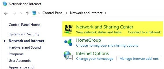 In the Control Panel, you can click on the Network and Internet category and then click on** Network and Sharing Center**. If you are in icon view, just click directly on Network and Sharing Center.
