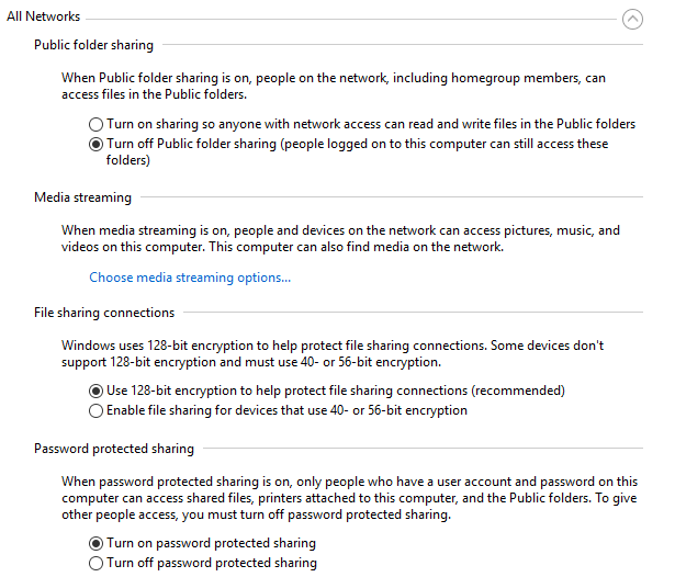 Public Folder Sharing – I recommend turning this off unless you specifically need to share data with another computer. The reason is that it’s very easy to accidentally save files into these publicly shared folders without realizing it, which will then be accessible by anyone on the network. A very useful feature when you need it, but a big privacy risk otherwise.