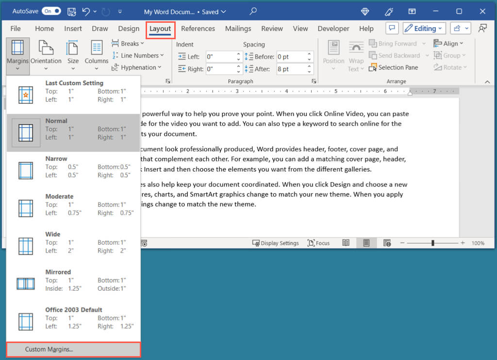 - Select the Margins drop-down menu in the Page Setup group and choose Custom Margins at the bottom.