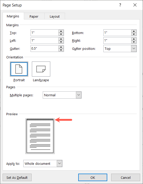- As you make your adjustments, you’ll see the Preview near the bottom on Windows and the right side on Mac. The gutter margin displays in a black and white checkered pattern.