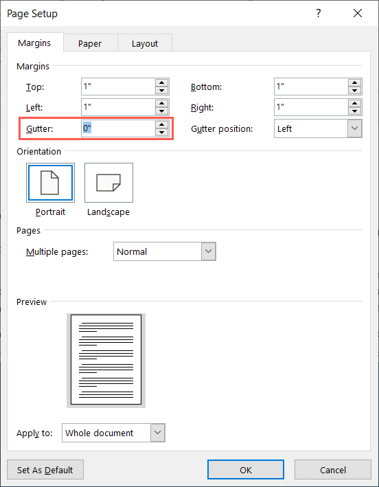 - Use the Gutter setting in the Margins section to set the size for the gutter margin.