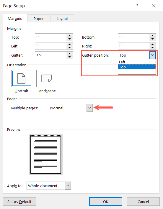 - If you’re using Normal in the Multiple Pages drop-down menu, you can also choose the Gutter position. Pick from Left or Top.