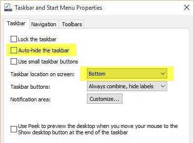 That will open up the taskbar properties dialog box where you will want to go ahead and uncheck the Auto-hide the taskbar box.