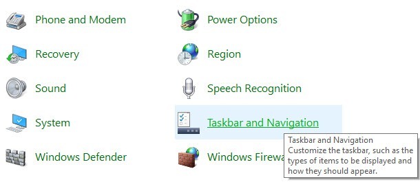To do this, you would normally have to right-click on your taskbar, but since that is missing, we have to go through the Control Panel and click on** Taskbar and Navigation**.