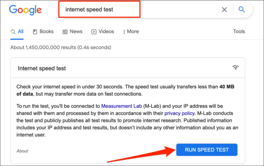 Open your web browser, google “internet speed test” and select Run Speed Test on the result page. You can also test your internet speed on websites like Speedtest.net or Fast.com.