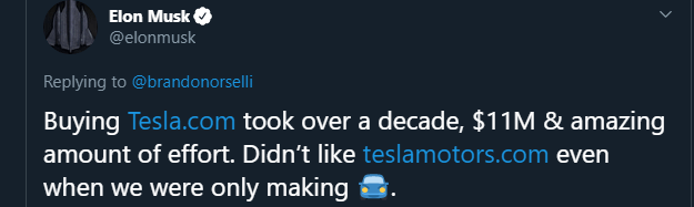 Tesla.com sold for $11 million with great effort in 2014 as a marketing attempt by Tesla, inc, because they believed teslamotors.com didn’t fit their overall future plans for the company.