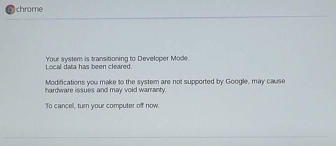Another con to Developer Mode is the ease with which you can re-wipe the data on your Chromebook. You wipe your device initially to enable Developer Mode. But after enabling Developer Mode, it is very easy to mistakenly wipe your data again. Each time you boot the machine in Developer Mode, you can disable Developer Mode with a single press of the space bar.