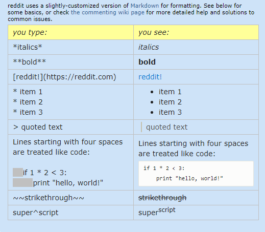 The example image above shows Markdown formatting examples for creating a new Reddit text post. While it does go over the basics of Markdown, some common examples have not been included. Let’s go over those.
