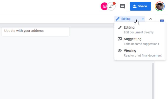 By default, Google Docs lets you make edits to a document and the edits take effect immediately. To switch the editing mode to suggested changes only, select the dropdown arrow to the right of the Editing word at the top right of the document.