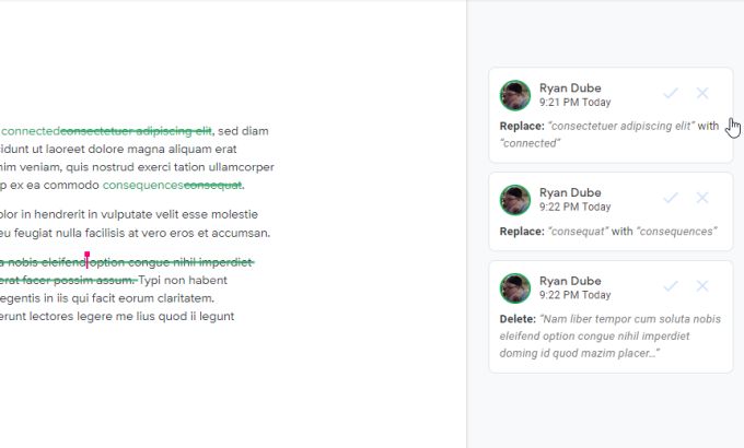 As you make edits to the document, text in the document is crossed out with the replacement text displayed next to it. Each edit opens a new comment to the right with a description of the edit that was made.
