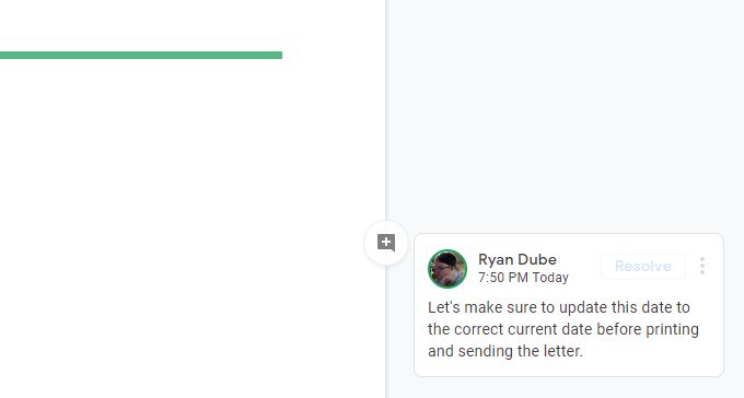 Resolving a comment makes it disappear from the comment thread. It appears as though the comment is deleted, but it’s actually only hidden from the right margin.