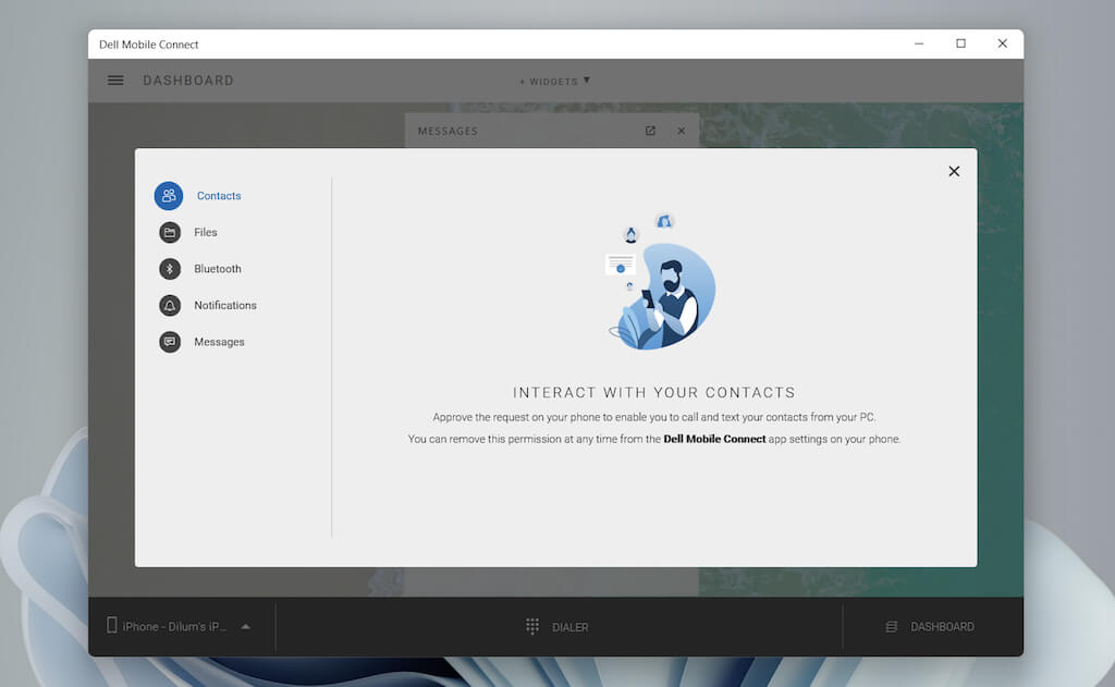- Follow the Dell Mobile Contact app’s instructions to provide it with permissions to your iPhone’s contacts, files, Bluetooth, notifications, and messages.