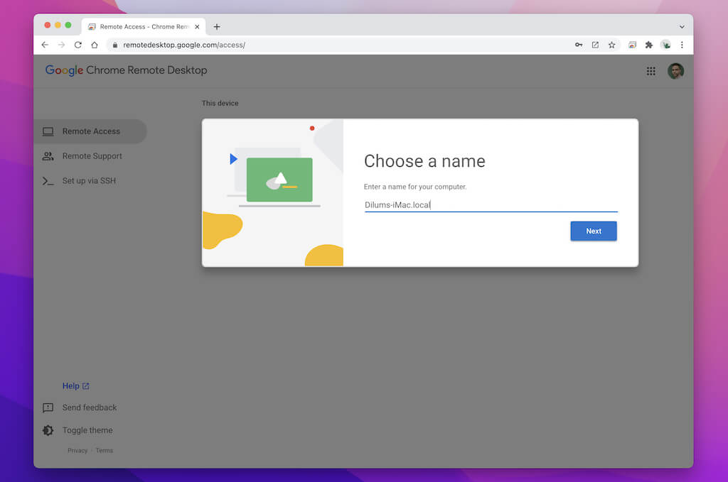 - On the Chrome Remote Desktop page, insert a name for your Mac or leave the default name intact. Select Next to continue.