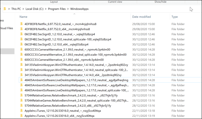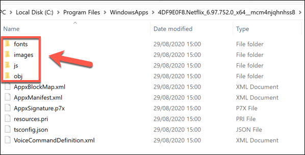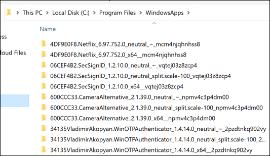 For example, the Netflix app folder is named 4DF9E0F8.Netflix_6.97.752.0_x64__mcm4njqhnhss8. The **4DF9E0F8.Netflix **component is the internal app name, while **6.97.752.0 **is the app version.