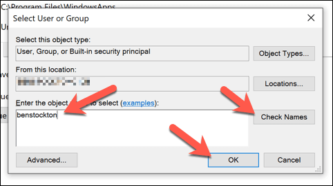 - In the **Select User or Group **box, type the username for your Windows user account, then select **Check Names** before selecting **OK**. For Microsoft accounts, type your email address instead.