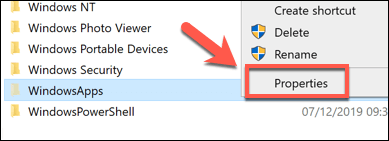 - To take control of WindowsApps, right-click the folder and select **Properties**.