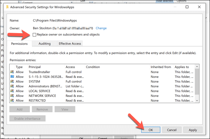 - Ownership of the folder will update to reflect your username (as seen in the **Owner** information at the top of the window). Make sure to enable the **Replace owner on subcontainers and objects** checkbox at the top of the menu. If you’re happy to proceed, select **OK **(or **Apply **>** OK**) to make the change.