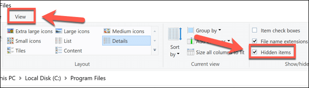- To start, open File Explorer on your Windows PC. Windows hides certain folders by default, so you’ll need to disable this first. To do this, select View > Hidden items. This will cause hidden files and folders to appear in the directory list on the right.