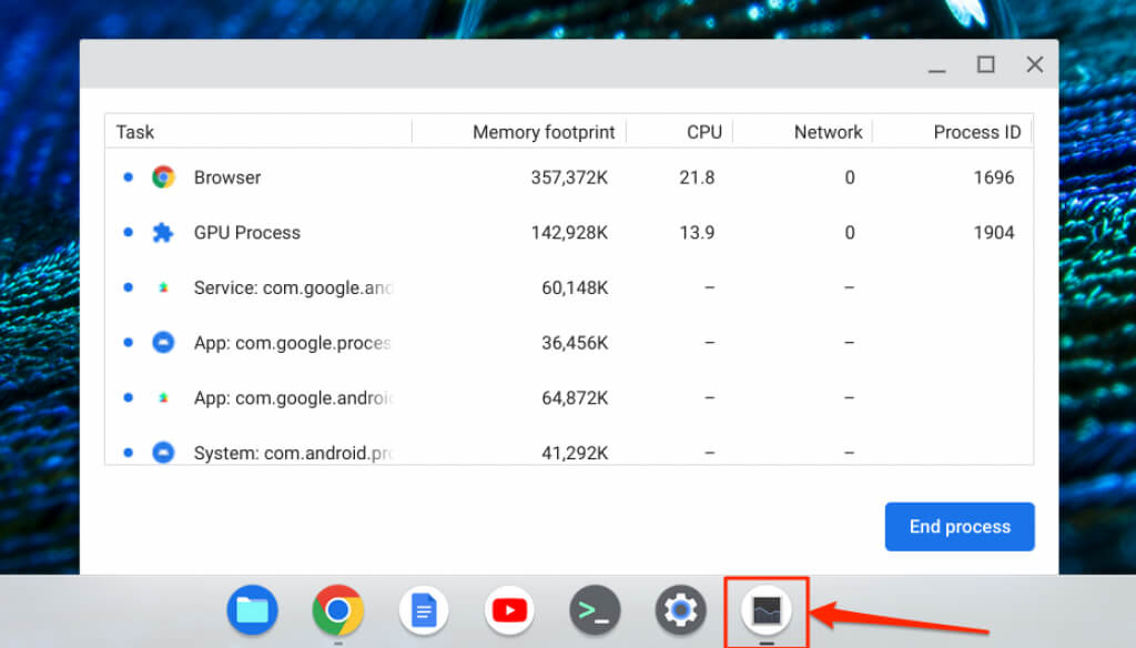 Your Chromebook should open Task Manager in a new window. You’d also see the Task Manager icon on your Chromebook’s shelf.