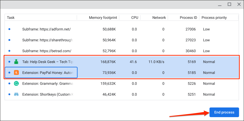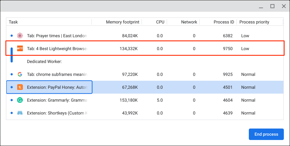 Select the tab or extension you want to close and select End process in the bottom-right corner.