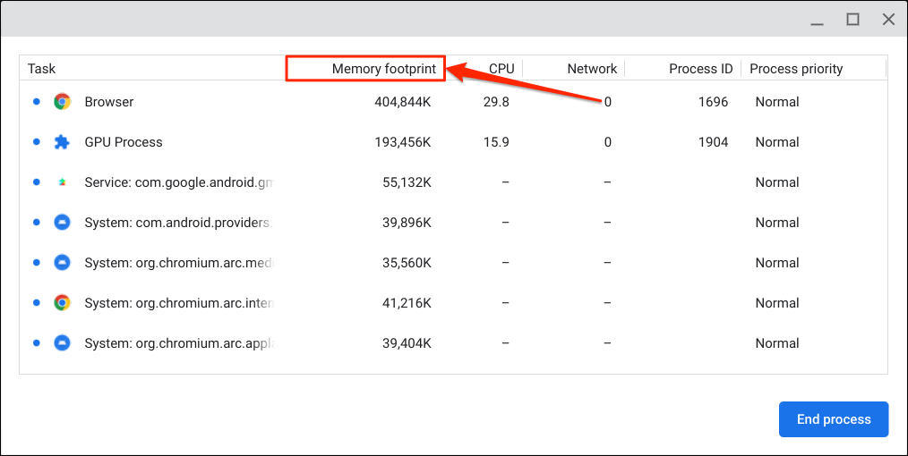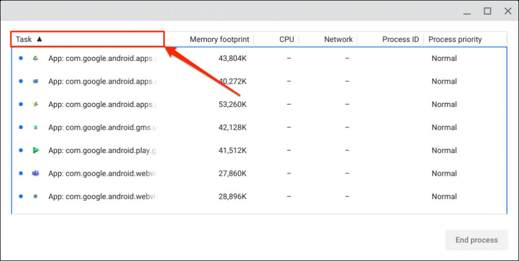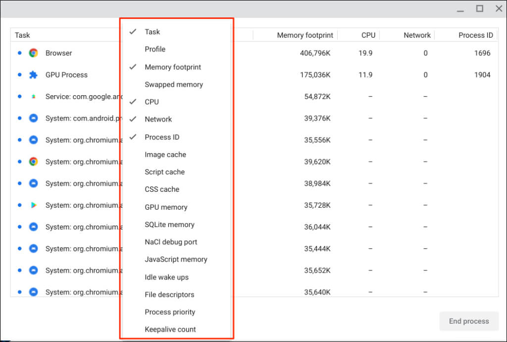 The ChromeOS Task Manager displays five columns by default—app/task name, memory footprint, CPU usage, network statistics, and process ID. However, you can customize the Task Manager’s parameters to your preference.