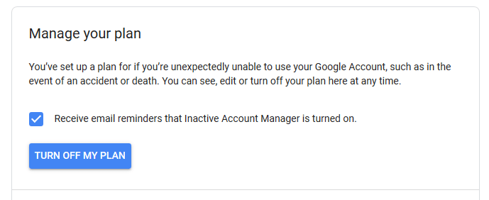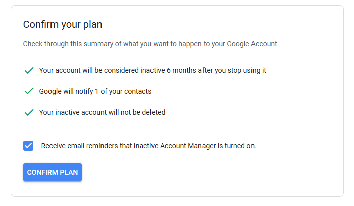 All looking good. Click “Confirm Plan” to switch Inactive Account Manager on.