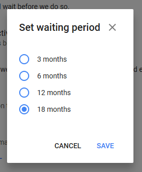 By default they set it at 18 months of inactivity but if you decide that is too long, you can change it by clicking on the little pencil arrow to the right and some more options appear.